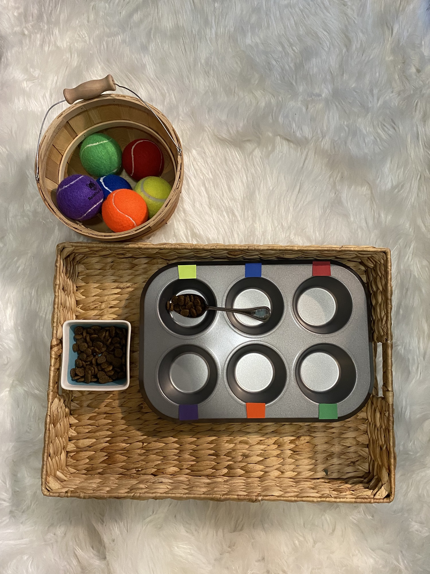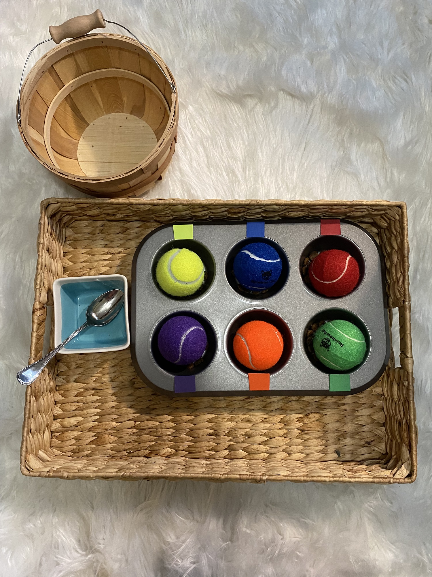 The child will use the spoon and spoon a small portion of kibble into each separate section of the muffin tin. When the kibble has been spooned into the sections, the child can then match the colored ball to the section of the muffin tin that has the corresponding color paper.